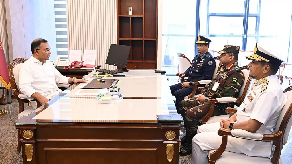 The chiefs of the three services paid a courtesy call on Prime Minister Tarique Rahman at the Secretariat on Thursday.